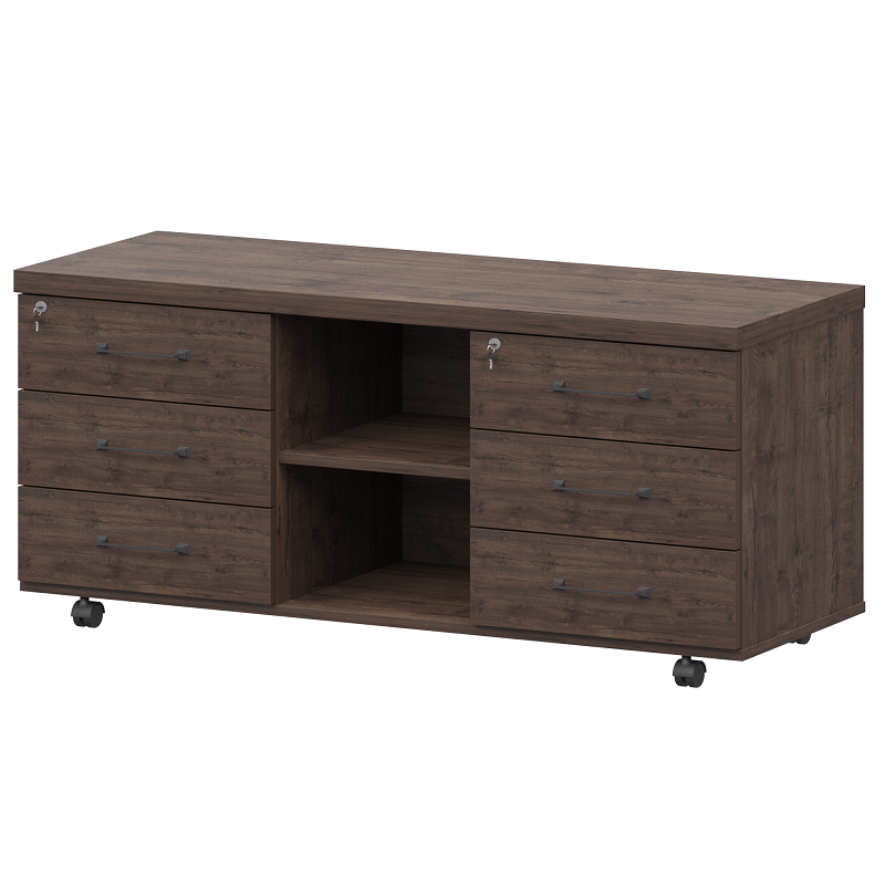 Внутреннее пространство греденции разделено двумя перегородками на три секции. Две боковые секции оснащены стационарными полками и закрыты распашными фасадами высотой 648 мм, установленными на регулируемые петли. Метод крепления петель к корпусу тумбы – евровинты. Центральная секция греденции оснащена четырьмя выдвижными ящиками, установленными на роликовые направляющие серого цвета. Верхний ящик оснащен врезным замком. Распашные фасады и выдвижные ящики греденции оснащены механизмами плавного закрывания. Лицевая фурнитура – металлическая, тип «закрытая скоба», цвет «серебристый», прямоугольной формы со скошенной под 45° лицевой гранью, длина не менее 135 мм (межцентровое расстояние 96 мм).